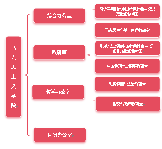 学院设有综合办公室、教学办公室、科研办公室3个科级行政机构以及6个教研室,初步形成一支师德高尚、结构合理、专兼职结合的思政课专职教师队伍。